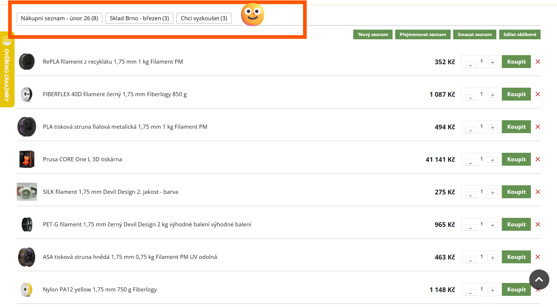 Valentýn je jen připomínka. Srdce ale může být každodenním pomocníkem při nákupu všeho, co potřebujete pro váš 3D tisk. Klikněte na ❤️, vytvořte si první vlastní seznam a zjednodušte si práci.