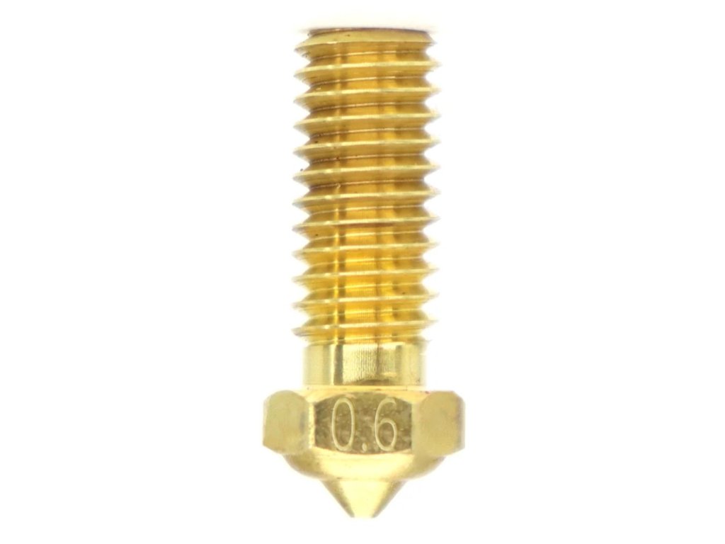 Kvalitní mosazná tryska 0,6 mm určená k tisku velmi širokého spektra 1,75 mm širokých strun.