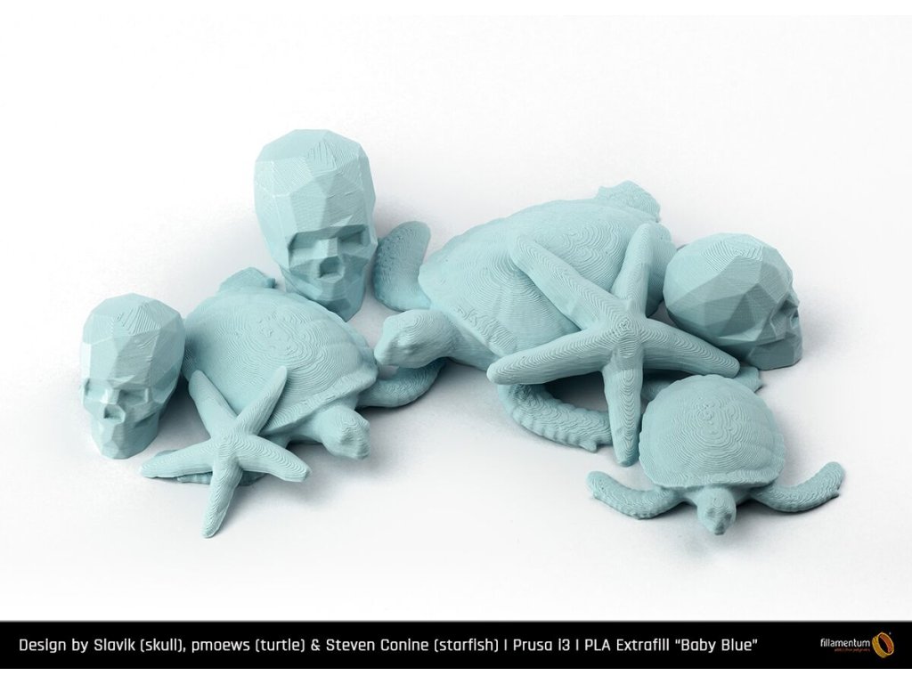 Fillamentum PLA Extrafill Baby Blue je materiál pro FFF (také známý jako FDM) technologie 3D tisku vyrobený v česku. Výhodou tohoto materiálu je snadné použití pro 3D tiskárny. Materiál umožňuje vysokou kvalitu tisku, i při náročných detailech. PLA vlákno je vyrobeno z přírodních surovin a je snadno biologicky odbouratelný složením. Fillamentum zaručuje vysokou přesnost rozměrů filamentu v toleranci +/- 0,05 mm, která je pod přísnou kontrolou v průběhu výroby.