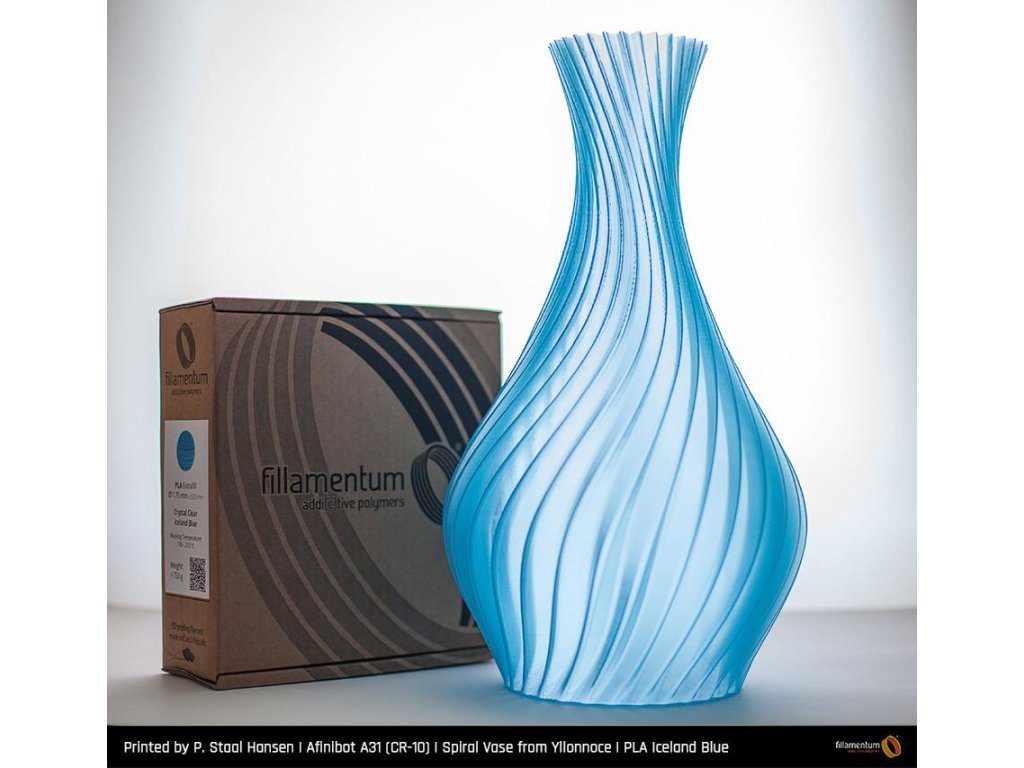 Průsvitný modrý filament PLA Crystal Clear Iceland Blue je materiál pro FFF (také známý jako FDM) technologie 3D tisku vyrobený v Česku značkou Fillamentum. Výhodou tohoto materiálu je snadné použití pro 3D tiskárny. Materiál umožňuje vysokou kvalitu tisku, i při náročných detailech.