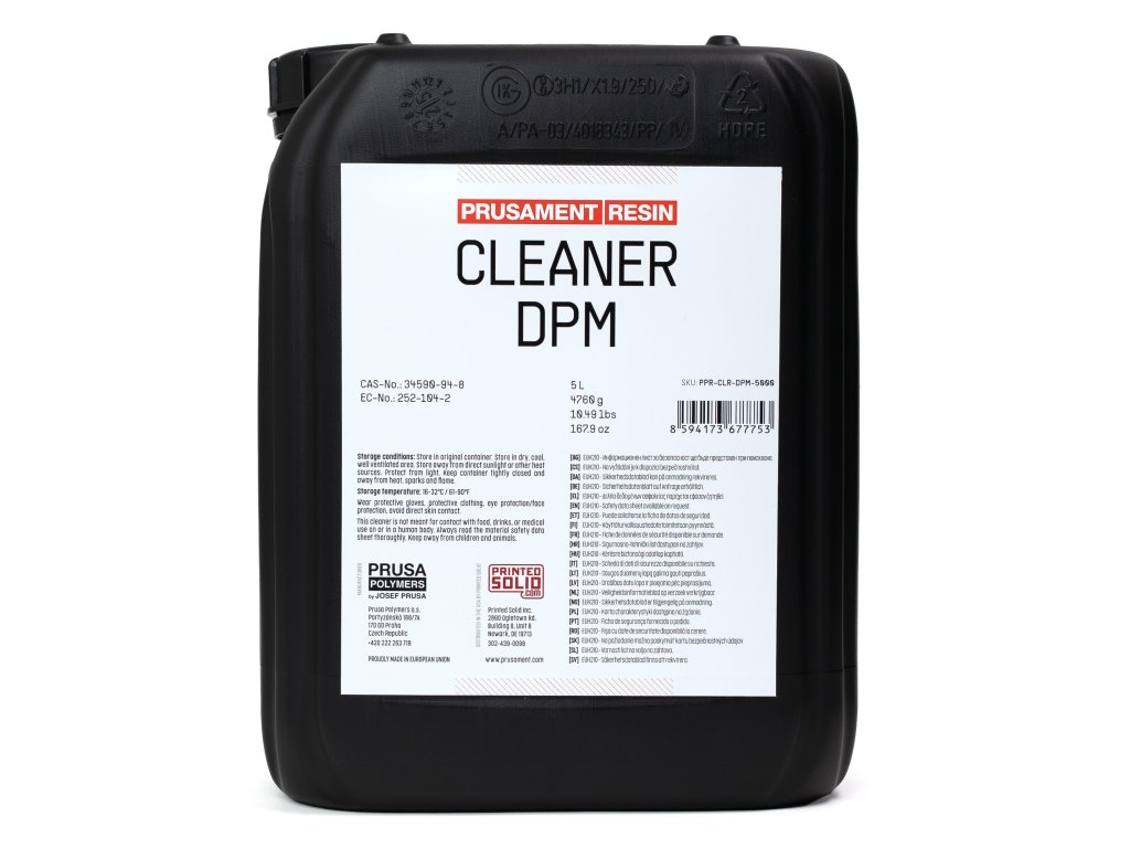 Prusament Resin Cleaner DPM o objemu 5 litrů představuje bezpečnější řešení pro mytí SLA výtisků ve srovnání s běžně používaným isopropylalkoholem. Má výrazně vyšší teplotu vznícení: riziko požáru při nesprávné elektroinstalaci nebo přítomnosti jisker je podstatně nižší. Díky nižší těkavosti dochází k výraznému snížení množství VOC látek ve vzduchu a čistič lze skladovat v otevřených nádobách delší dobu. Zároveň má velmi nízkou toxicitu a nevyžaduje výstražné piktogramy jako IPA. Na rozdíl od isopropylalkoholu netvoří nestabilní peroxidy.