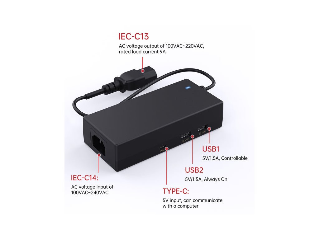 - Napájecí výstup: IEC-C13 100–220 V AC