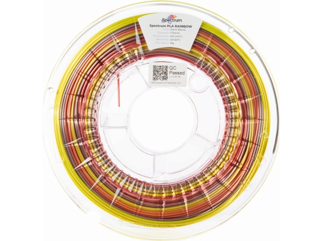 Silk Rainbow v odstínu nazvaném Earth Blend od značky Spectrum je filament na bázi PLA s barevnými aditivy, které propůjčují tištěným modelům velmi lesklý saténový povrch, což do značné míry snižuje viditelnost vrstev tištěných produktů. Použitím speciálně vyvinutého pigmentu je možné zachovat klasické vlastnosti materiálu PLA, tj. jednoduchý a bezproblémový tisk, při dosažení velmi nízkého smrštování a relativně vysoké pevnosti v tahu. Tento materiál je tedy určen pro ty, kteří ocení jednoduchý tisk a velmi vysoké estetické vlastnosti.