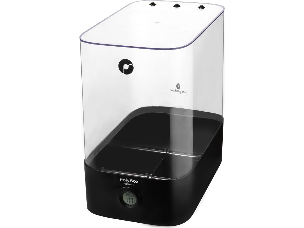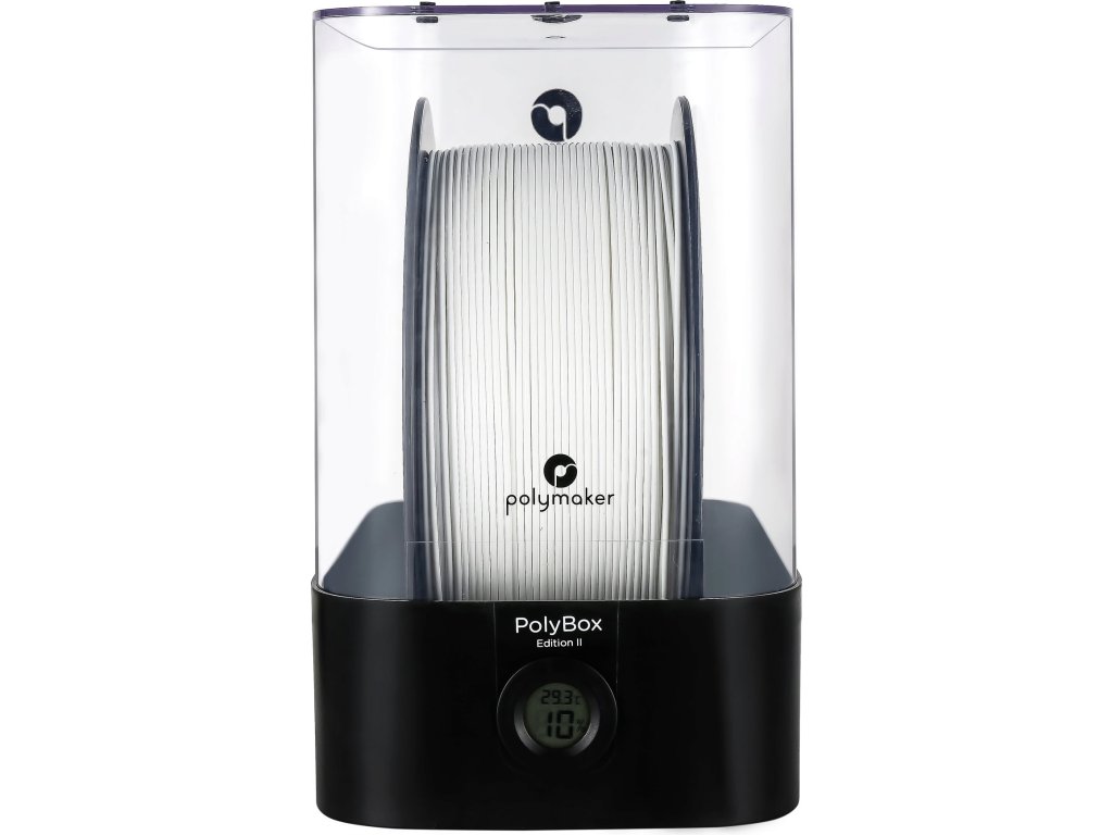 PolyBox obsahuje teploměr a vlhkoměr pro monitorování tiskových strun uvnitř boxu. Vlhkost je pohlcována velkými vysoušecími sáčky. PolyBox je vhodný zejména pro materiály nasákající vlhkost (hygroskopické) . např. pro PolySmooth (PVB), PVA nebo nylon, aj. PolyBoxu je velikostně uzpůsobený pro dvě 1 kg cívky nebo jednu 3 kg cívku. Použít můžete filamenty jak o průměru 1,75 mm, tak 2,85 mm.
